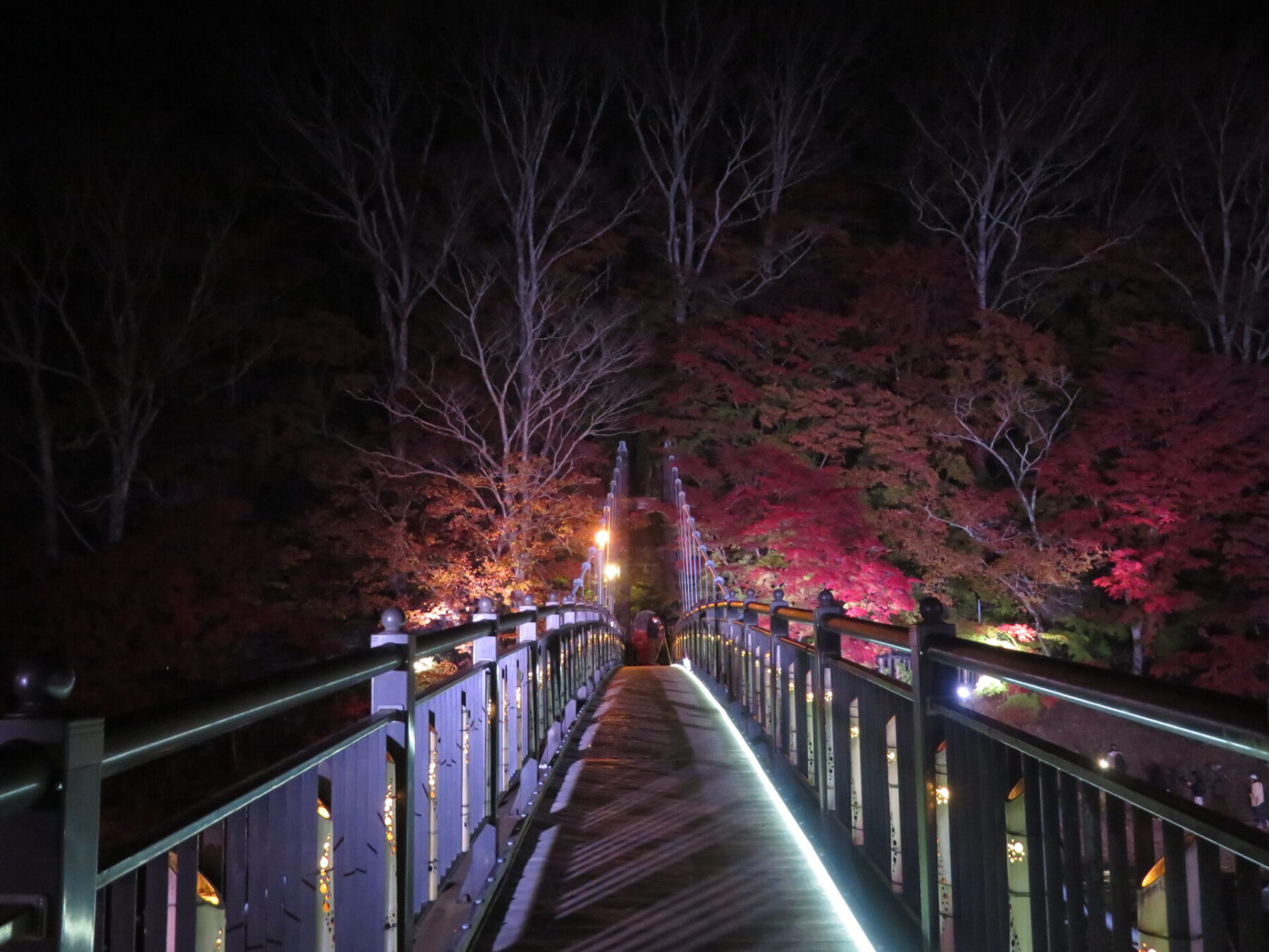 秋になると一面が深紅に染まる橋、紅(くれない)の吊橋。塩原随一の美しさを誇ります。青空の下で見るモミジはもちろん綺麗ですが、ライトに照らされ浮かび上がるモミジはとてもロマンチックです。ぜひ大切な人と一緒にお越しください。