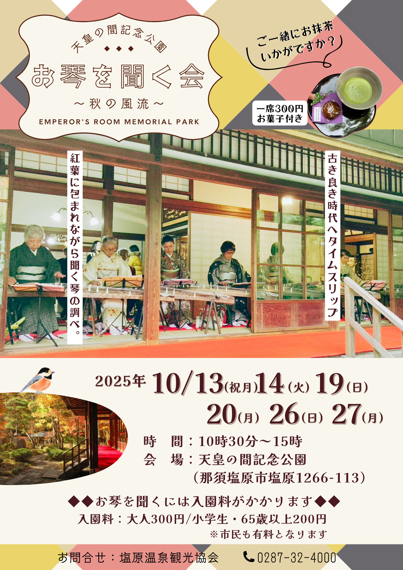 - 10月13日(祝・月)~10月27日(月)で計6回 天皇の間記念公園 風流・お琴を聞く会