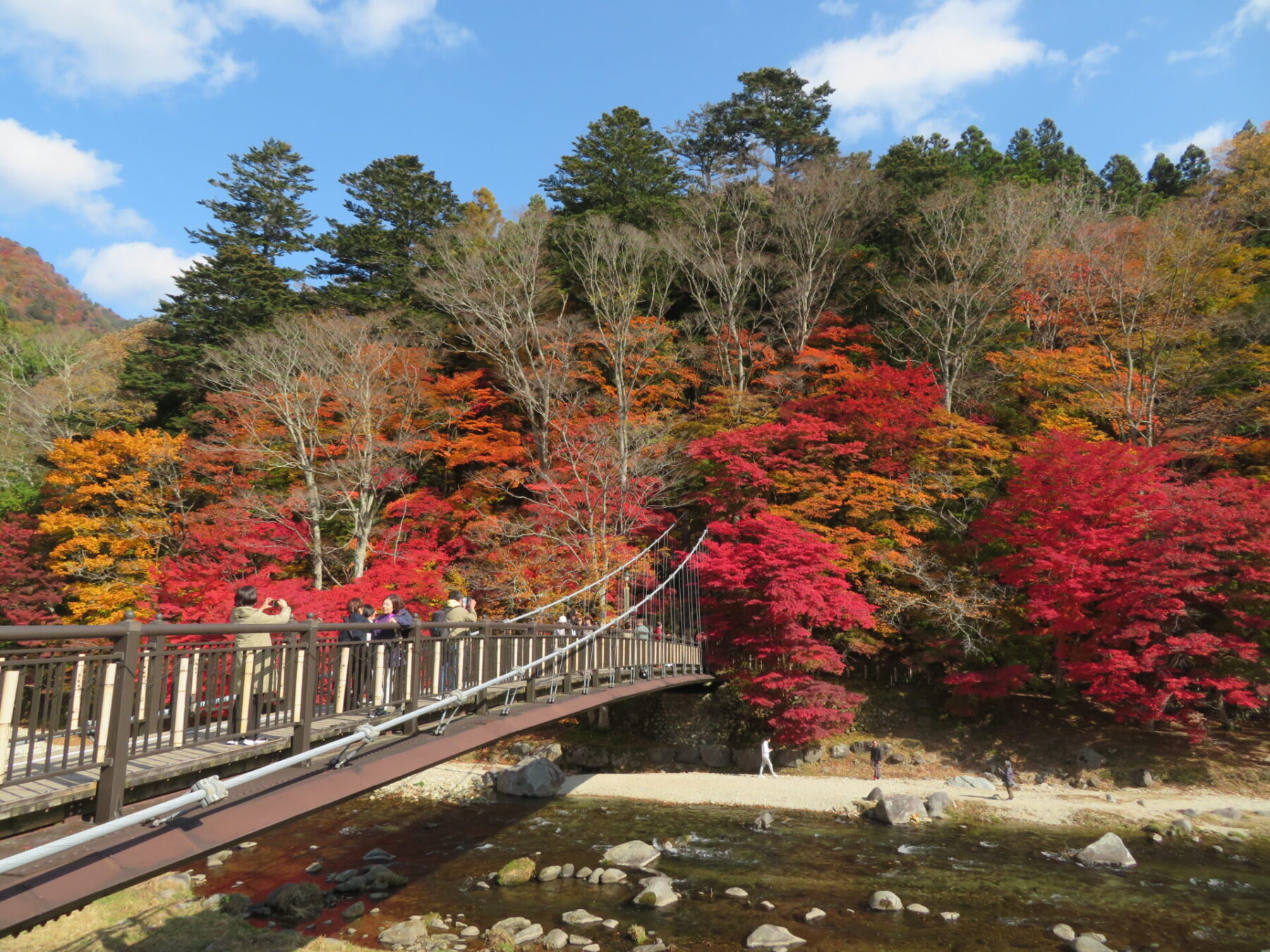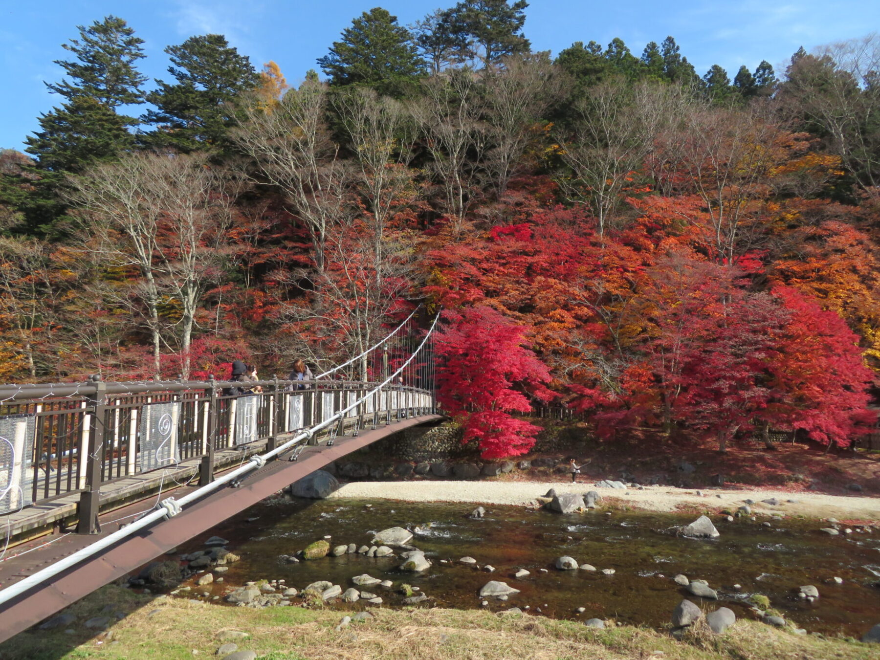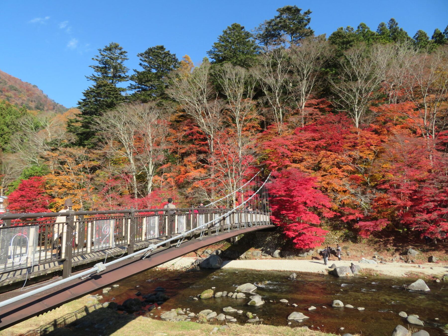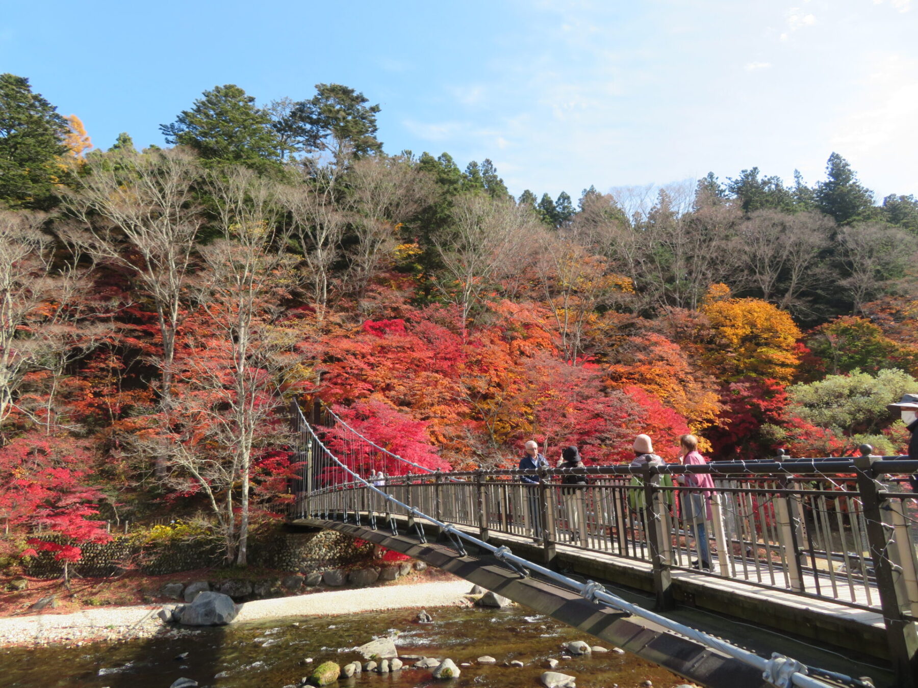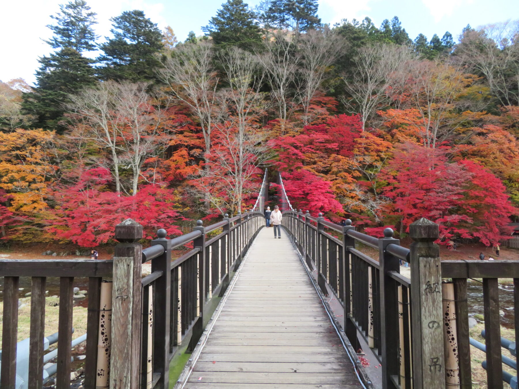 吊橋の左側モミジは落葉しているところもありますが、皆さま綺麗な箇所を見つけてはお写真撮られています。あと1週間は楽しめるかと思います♪