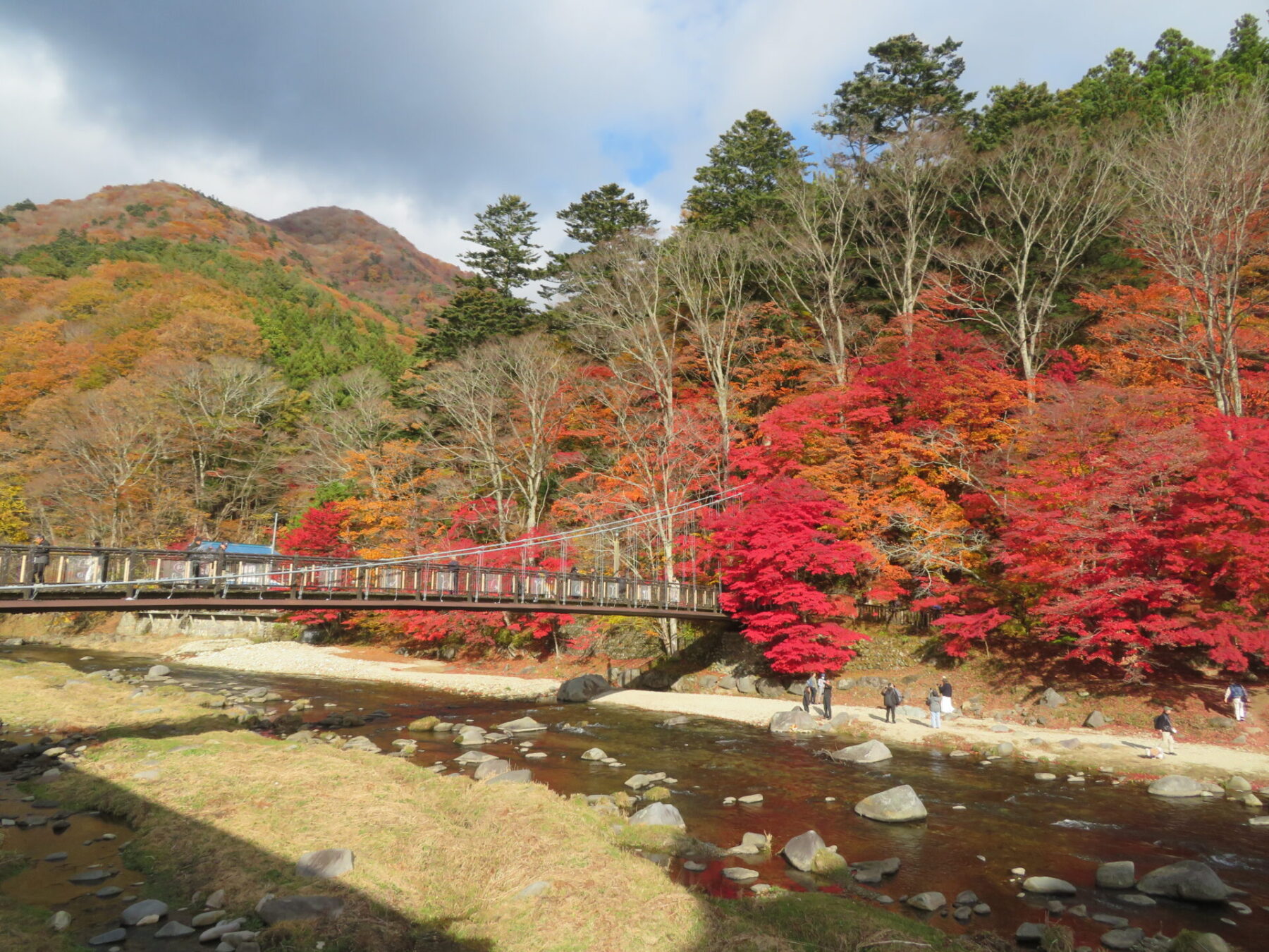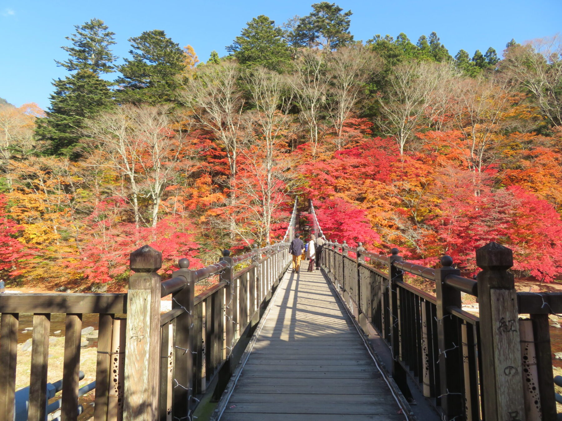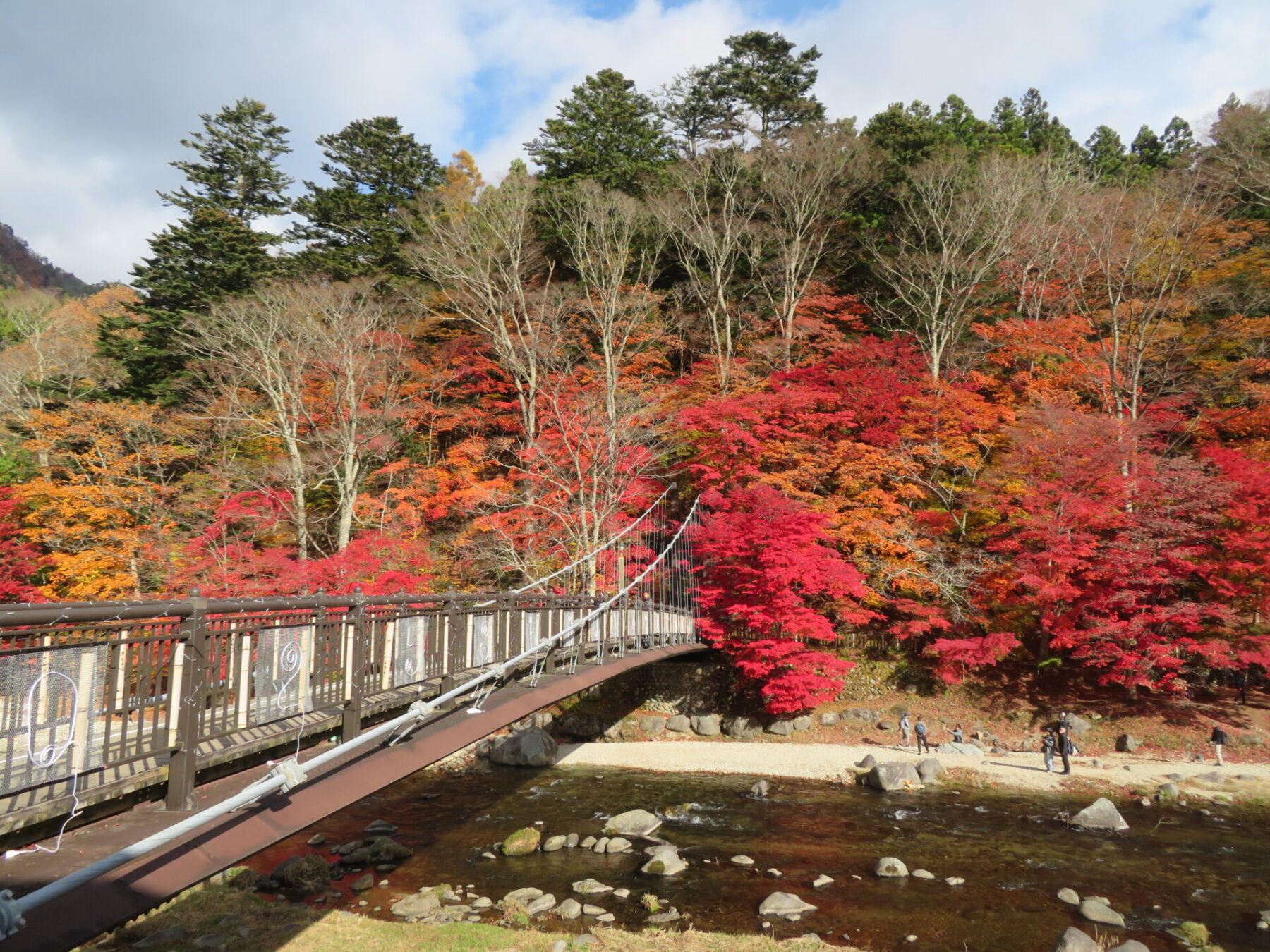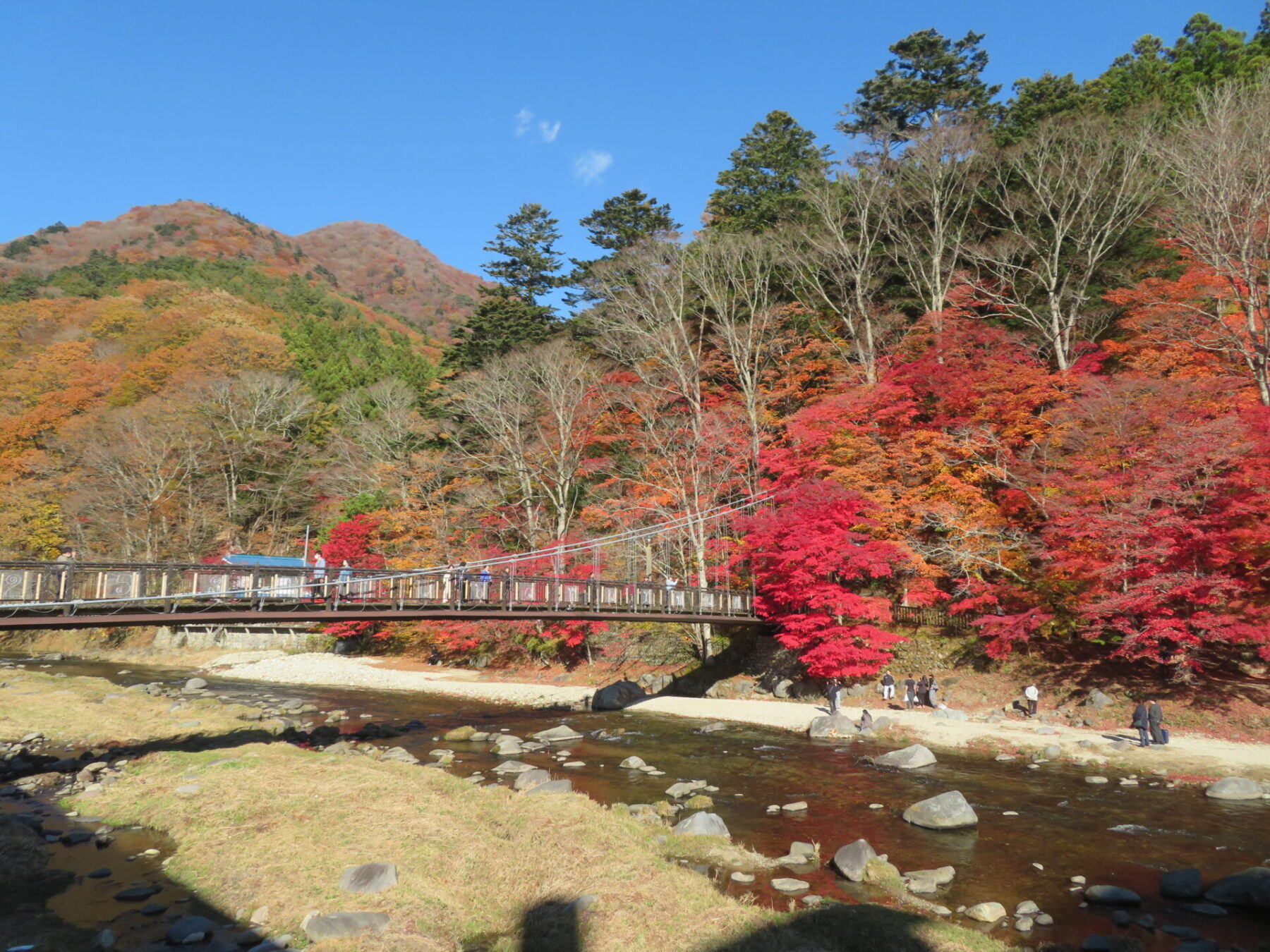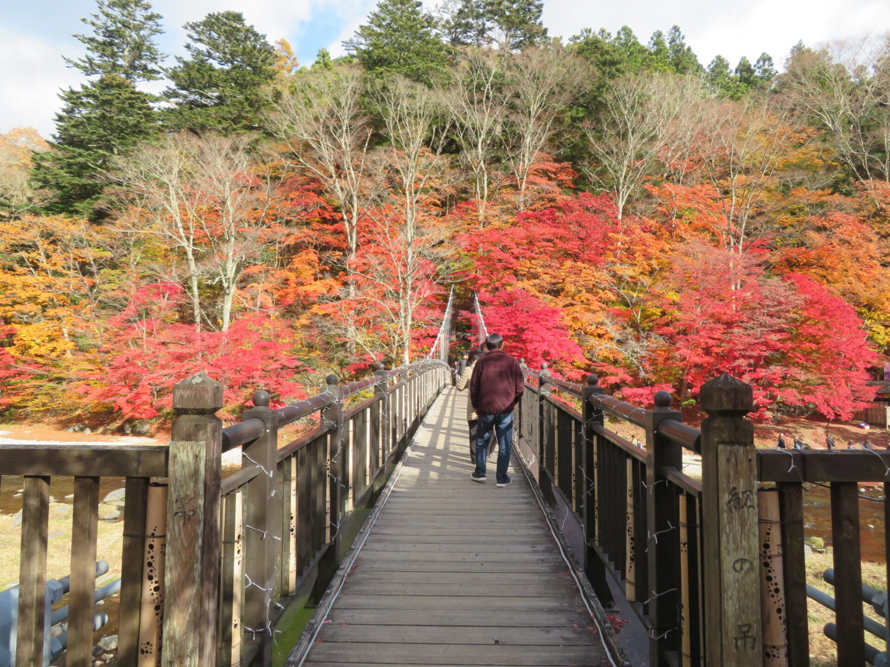 吊橋の左側モミジは落葉しているところもありますが、皆さま綺麗な箇所を見つけてはお写真撮られています。あと1週間は楽しめるかと思います♪
