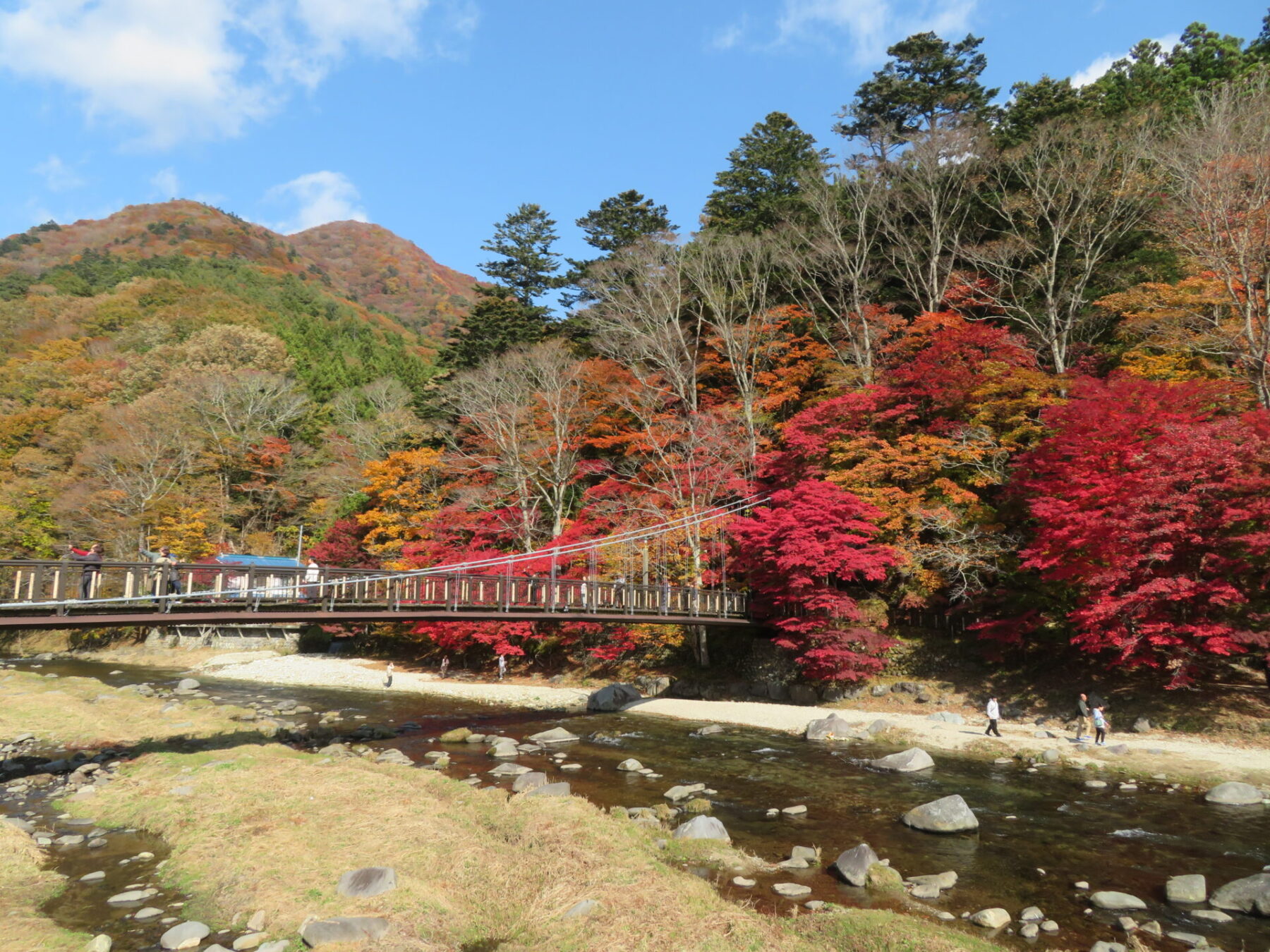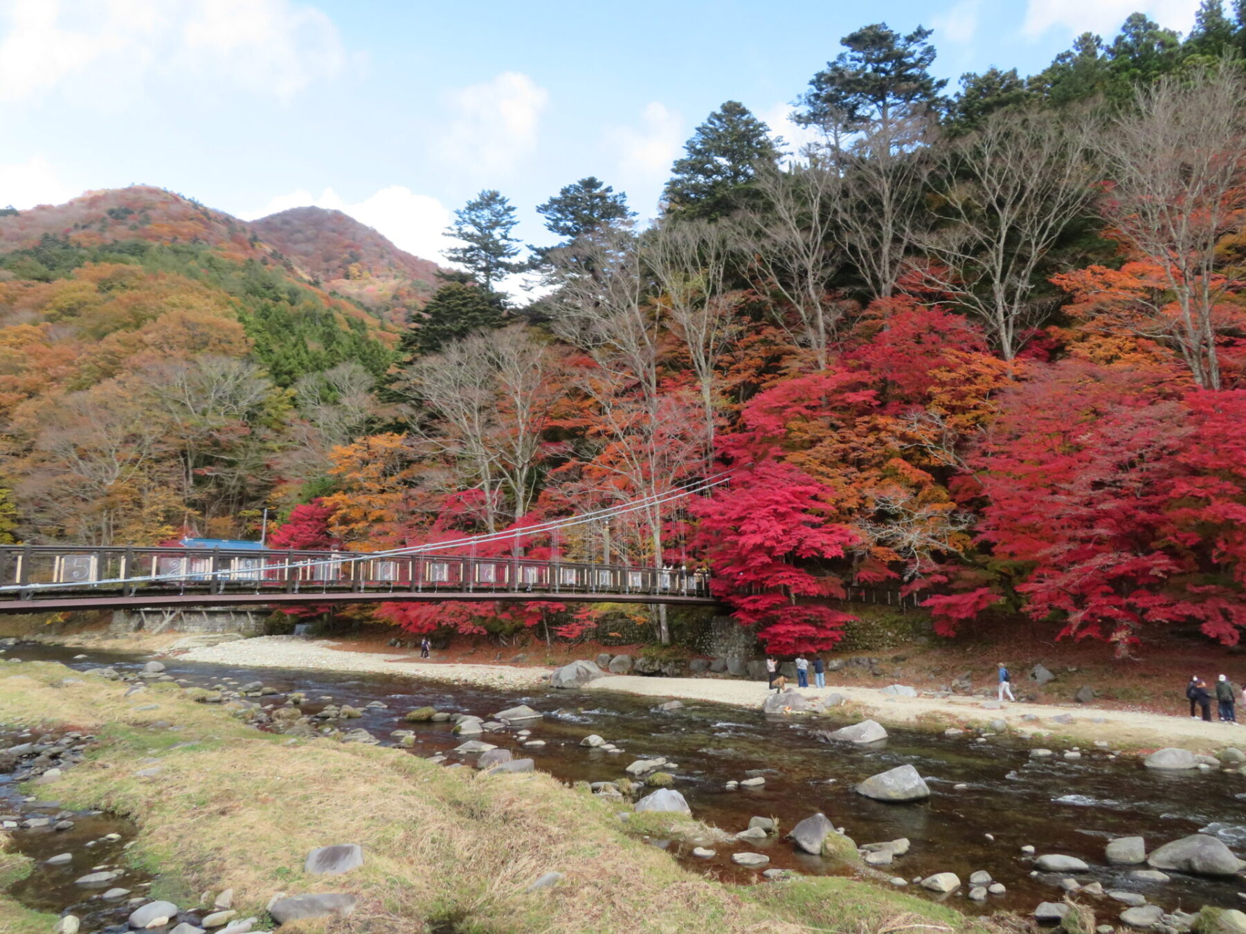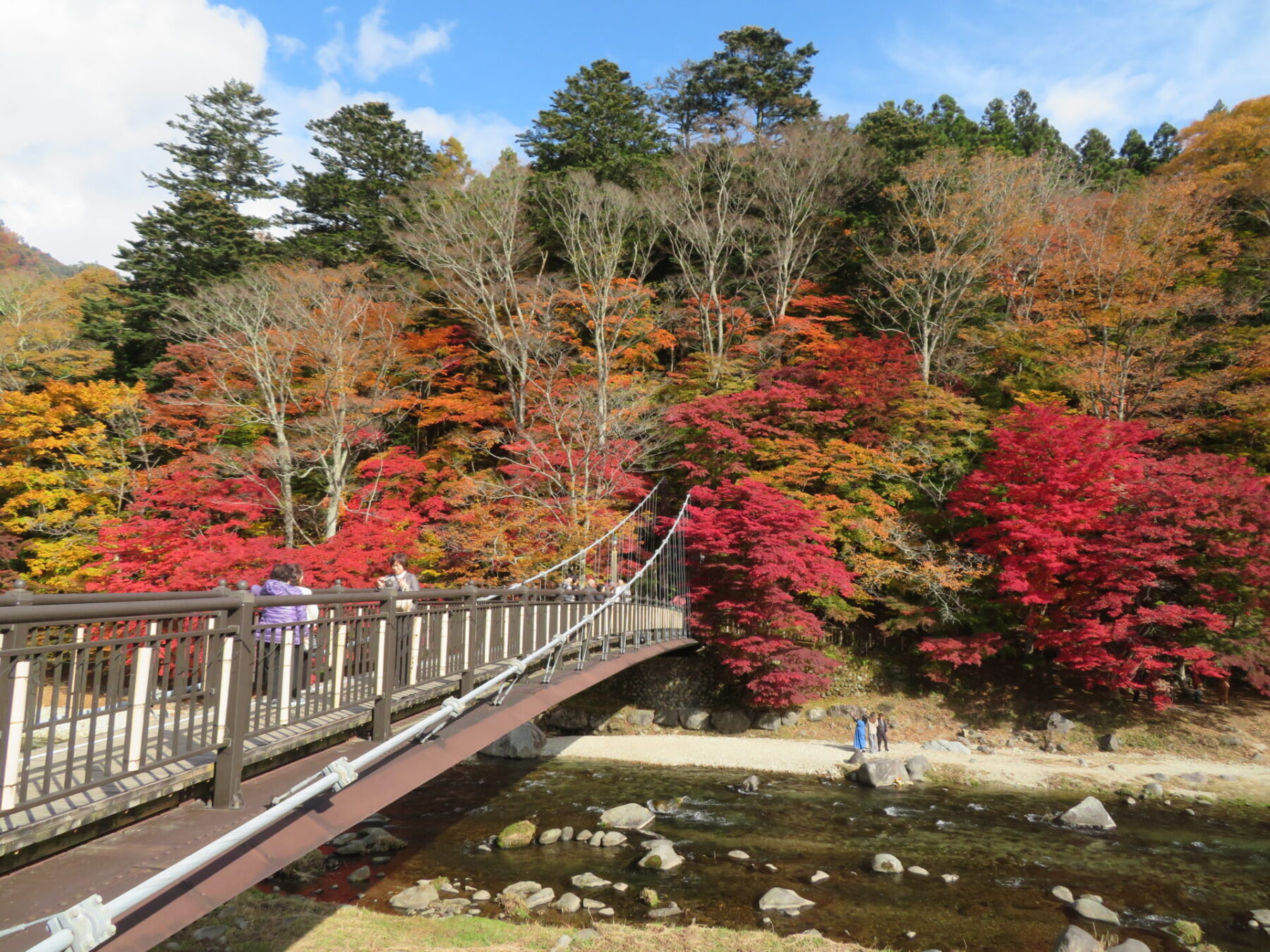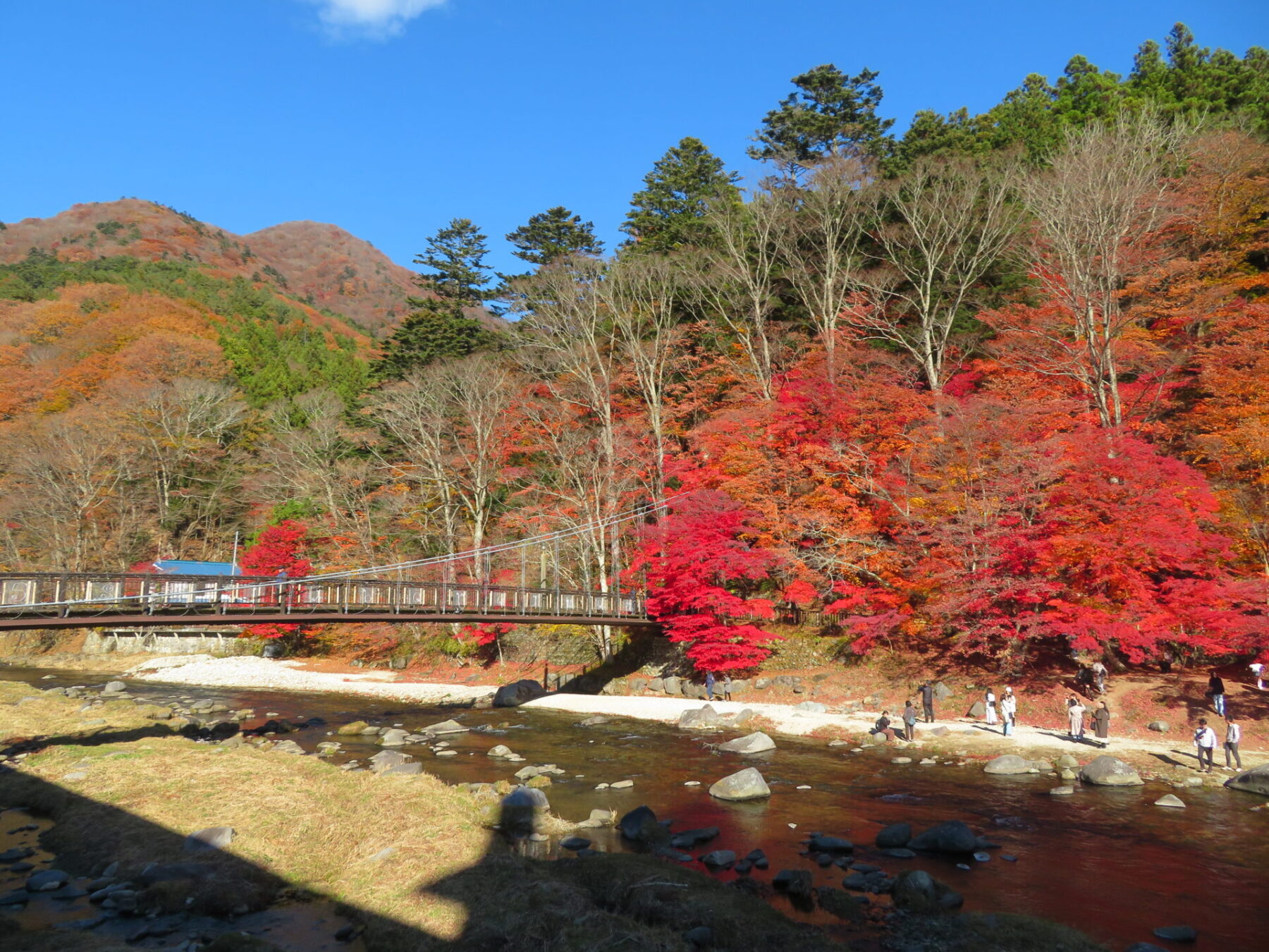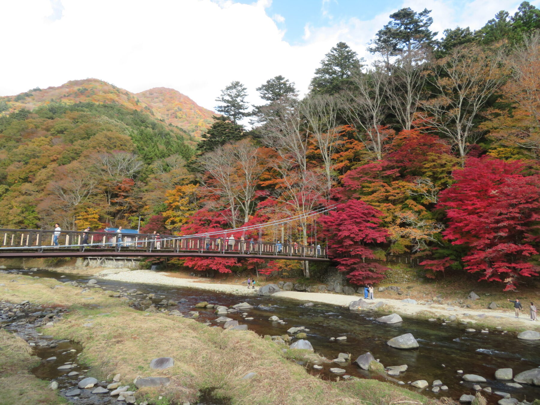 吊橋の左側モミジは落葉しているところもありますが、皆さま綺麗な箇所を見つけてはお写真撮られています。あと1週間は楽しめるかと思います♪