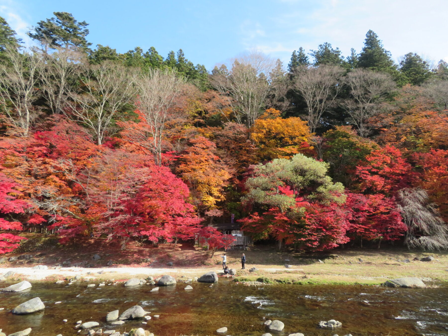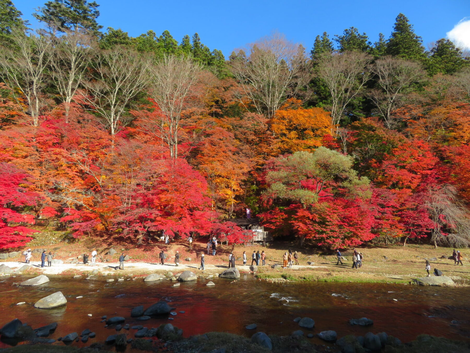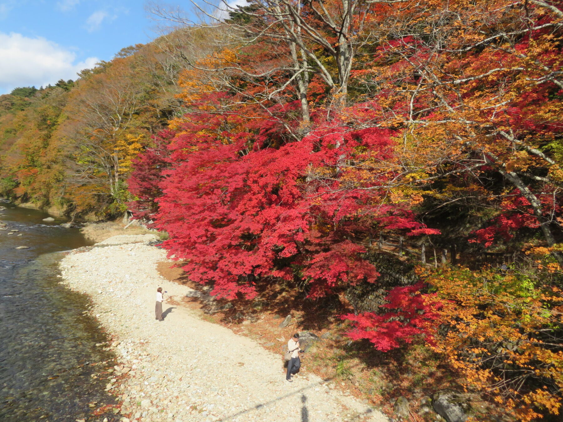 対岸から川辺に降りられますので、間近にモミジを見ることができます。