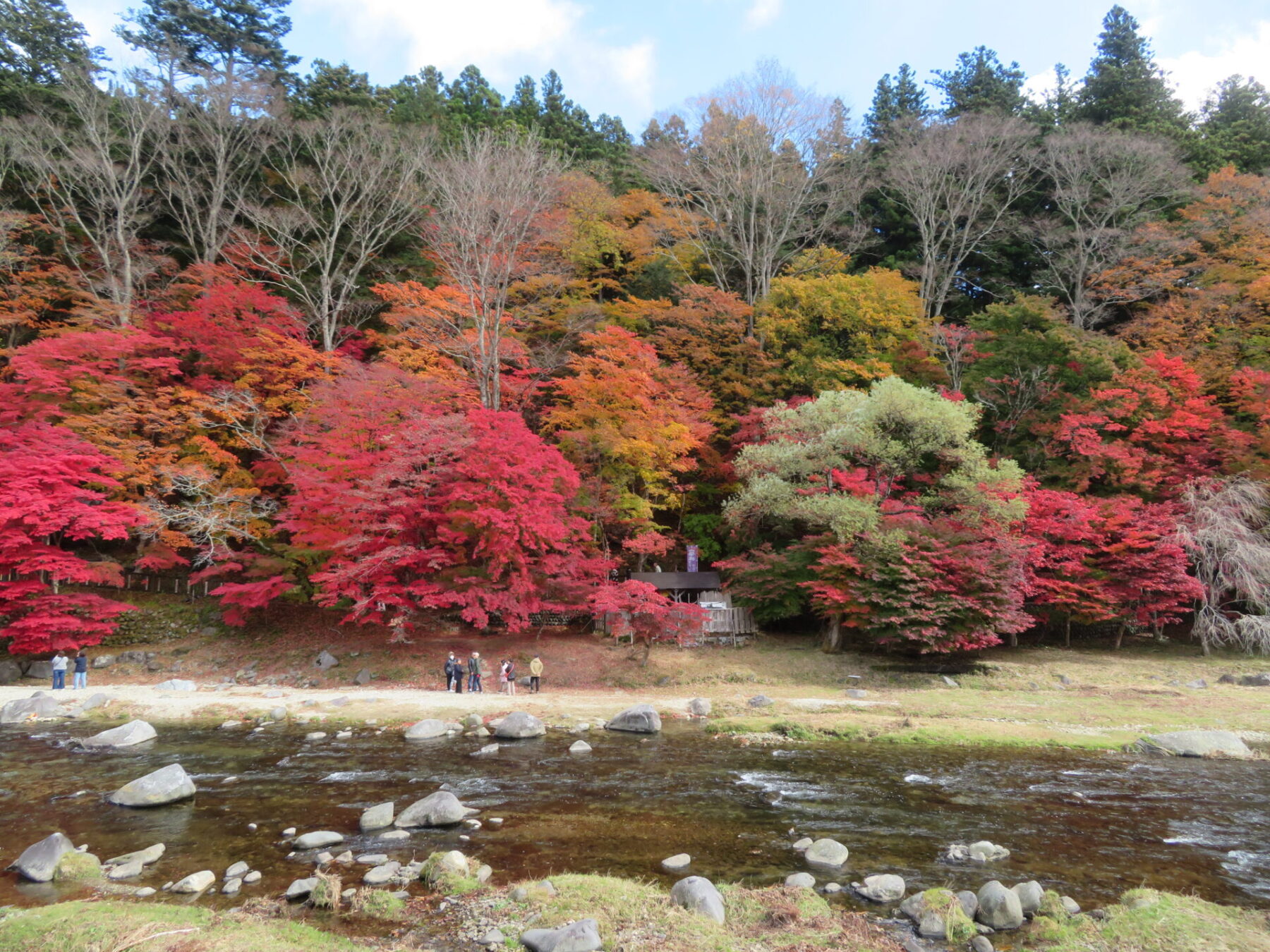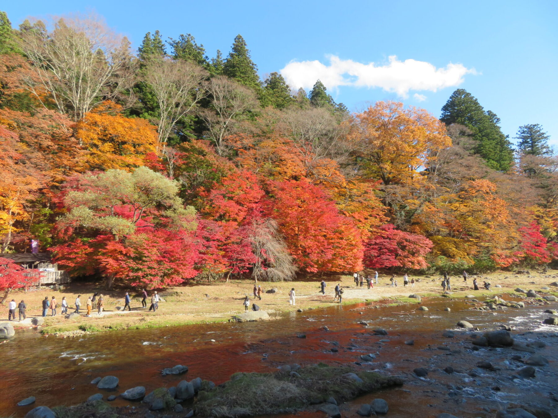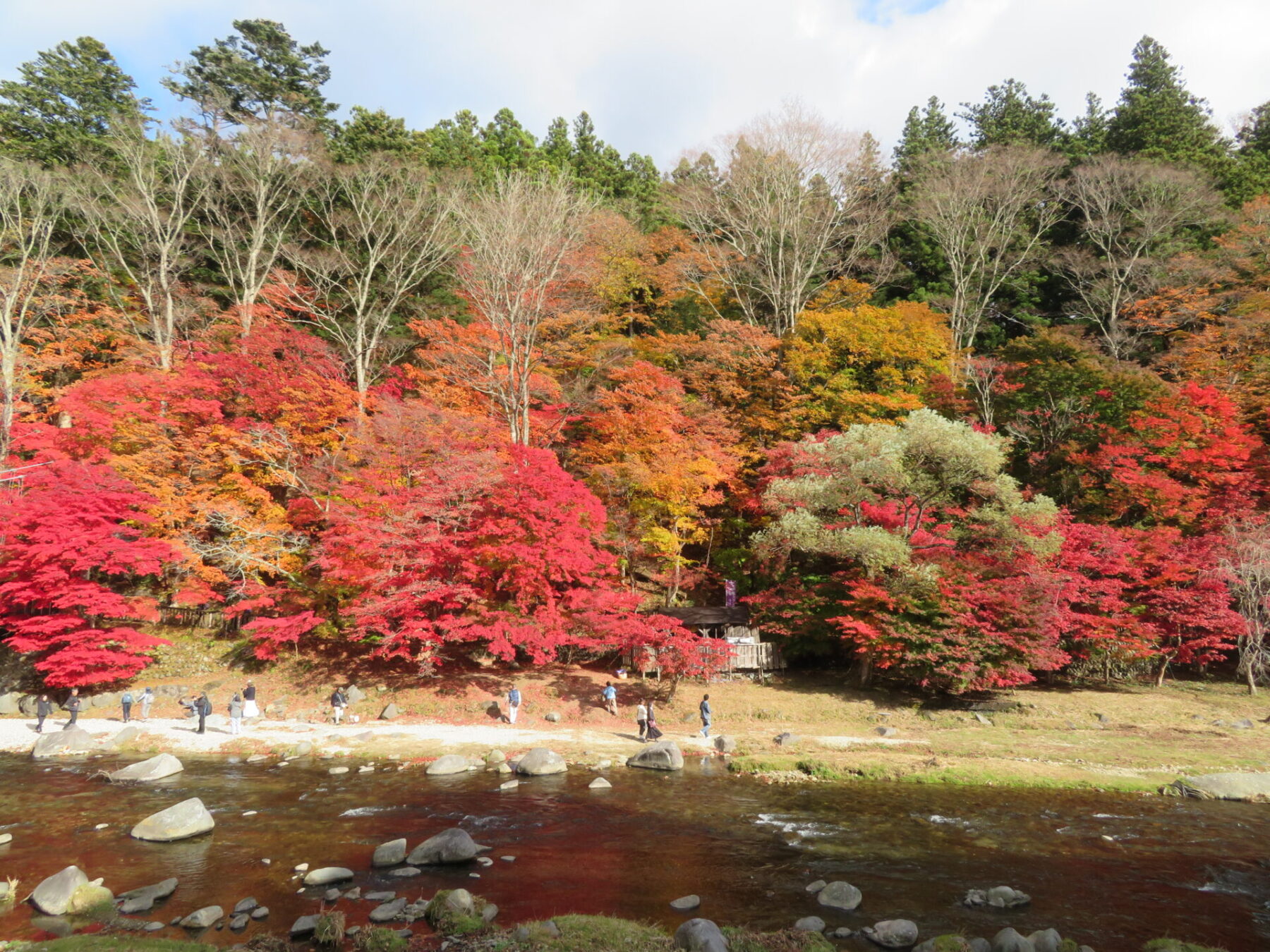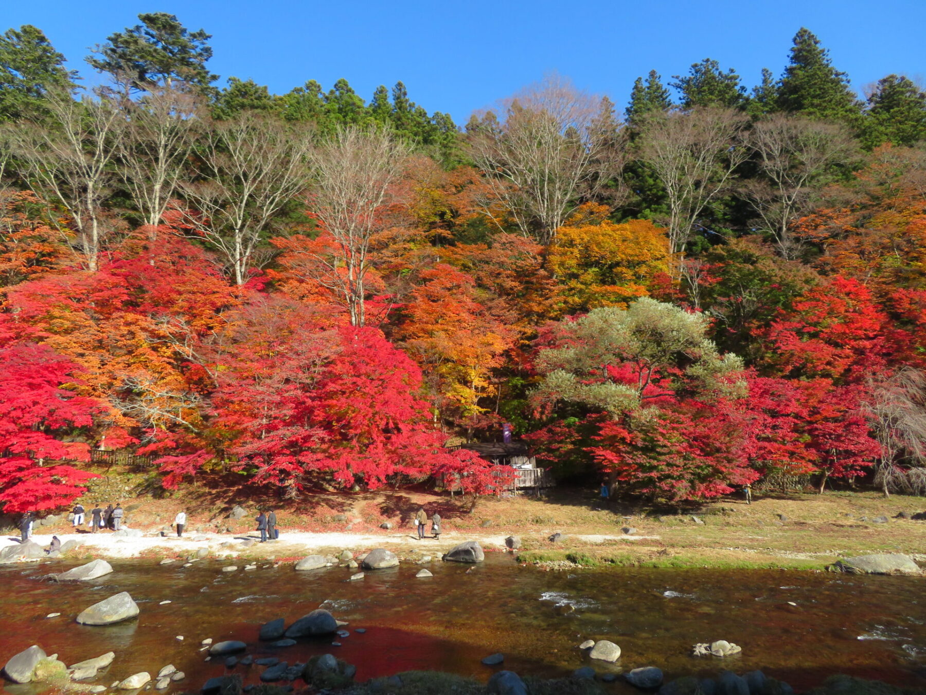対岸から川辺に降りられますので、間近にモミジを見ることができます。