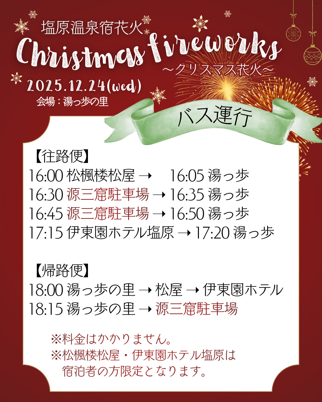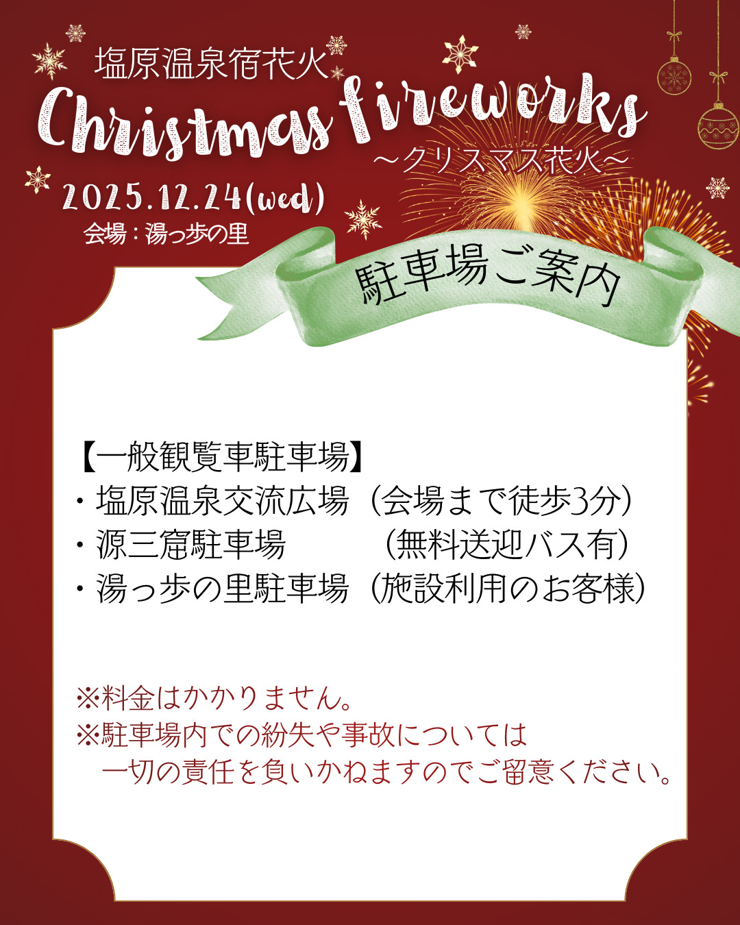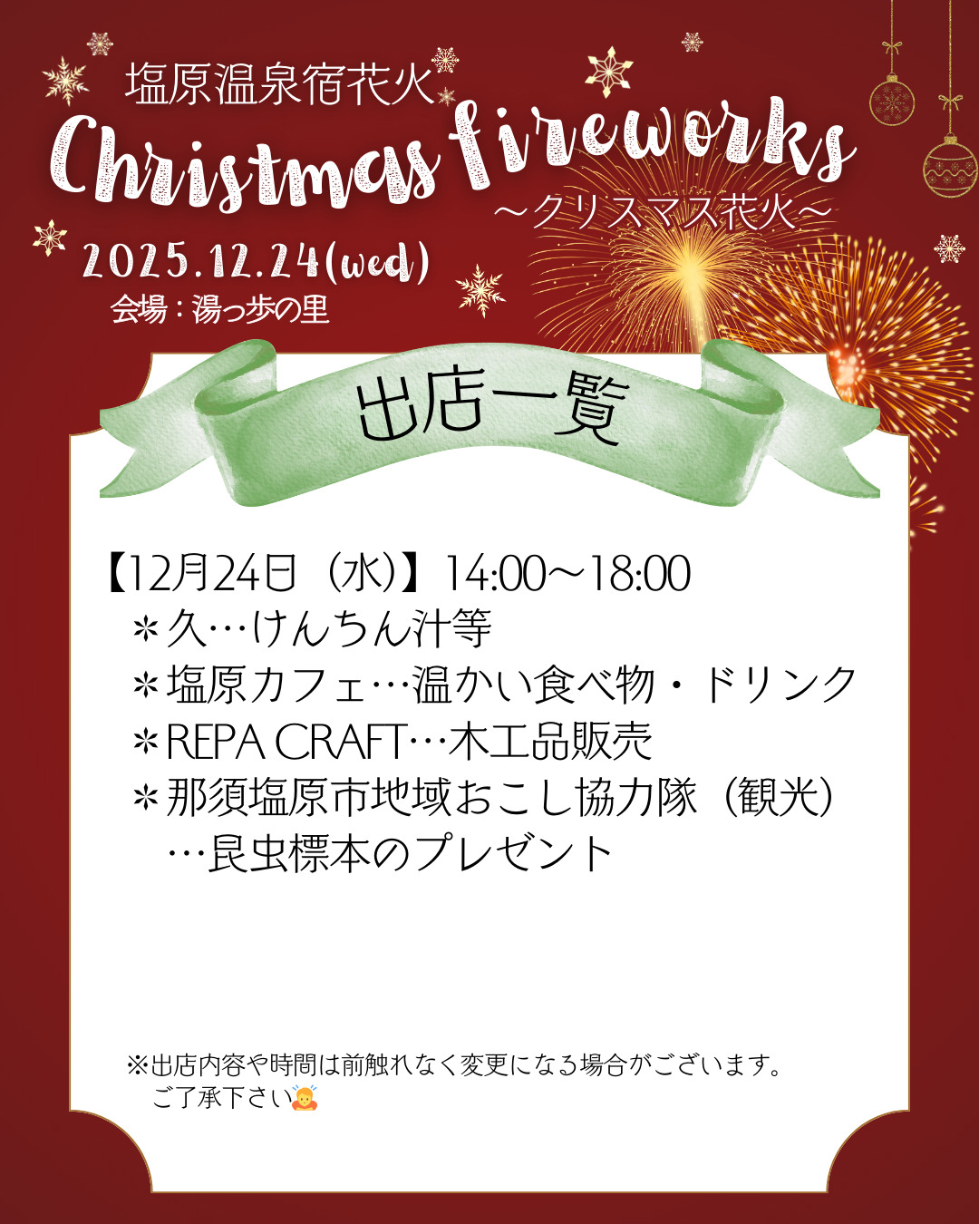 塩原温泉では、クリスマスイブの夜を彩る「塩原温泉宿花火 ~クリスマス花火~」 を開催します。