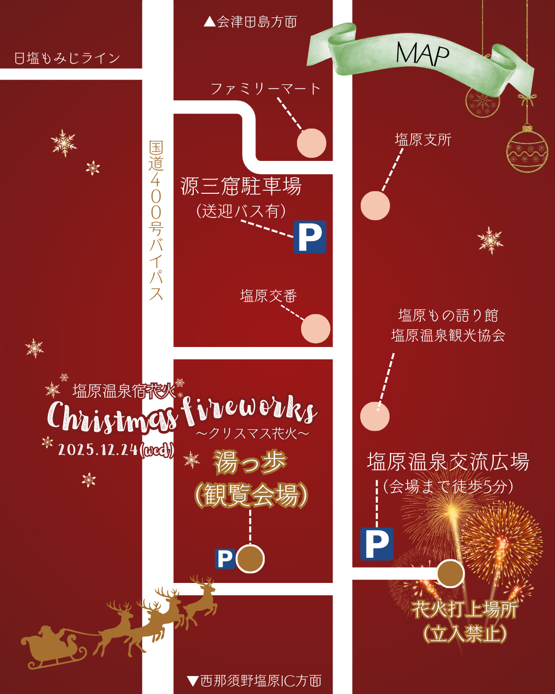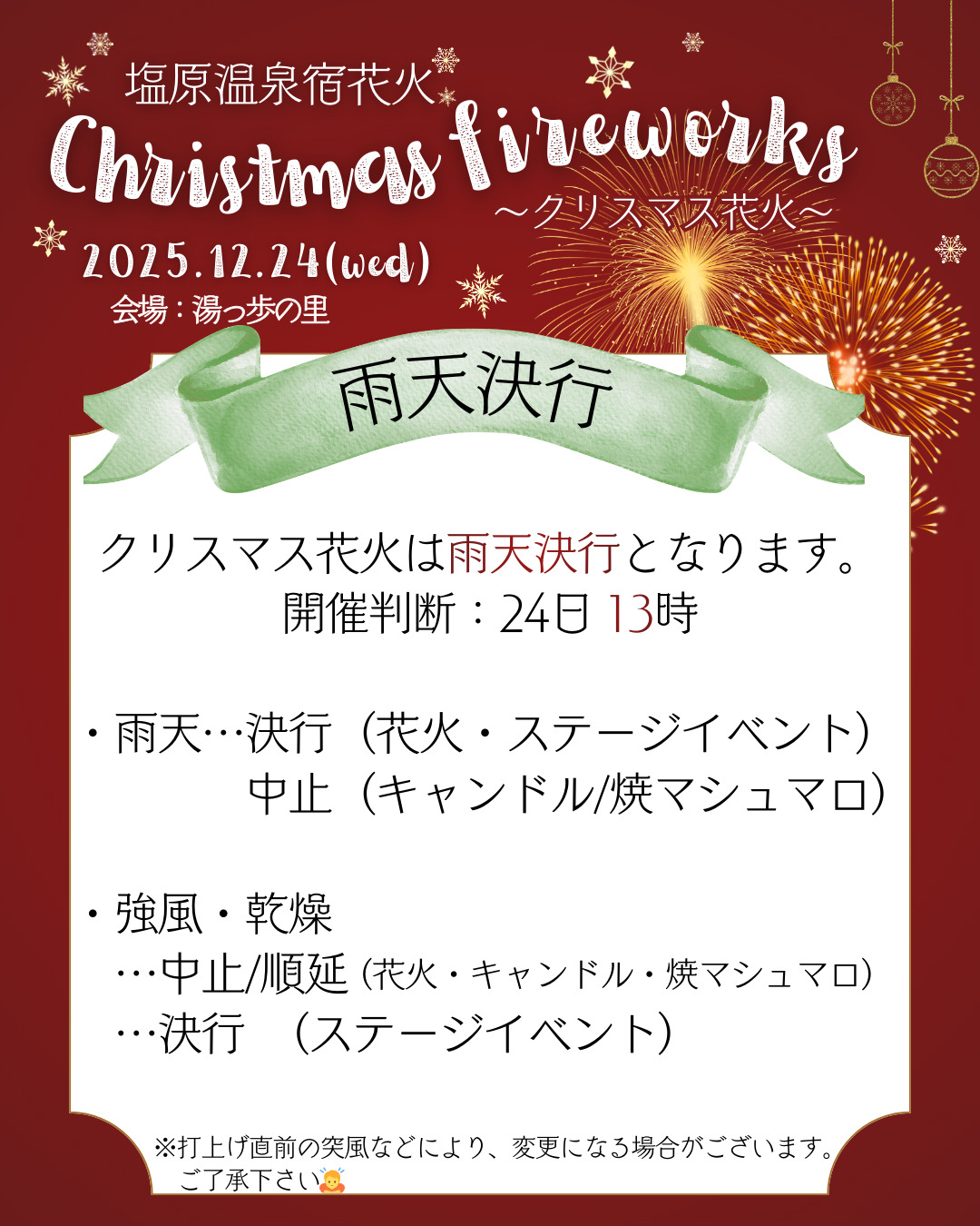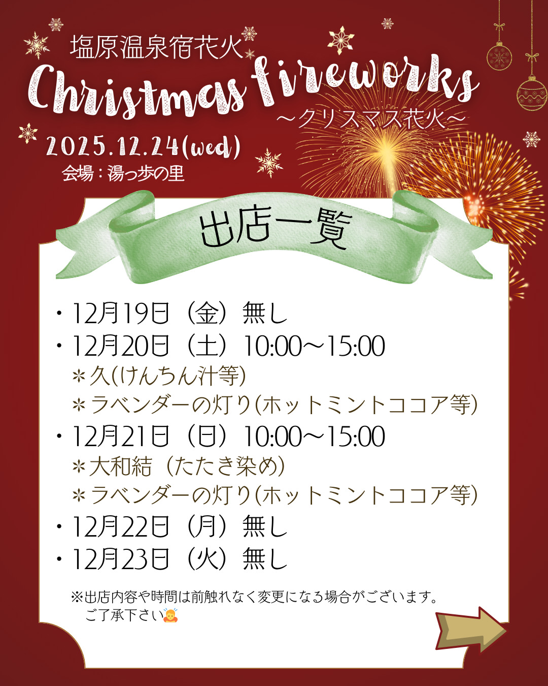 塩原温泉では、クリスマスイブの夜を彩る「塩原温泉宿花火 ~クリスマス花火~」 を開催します。