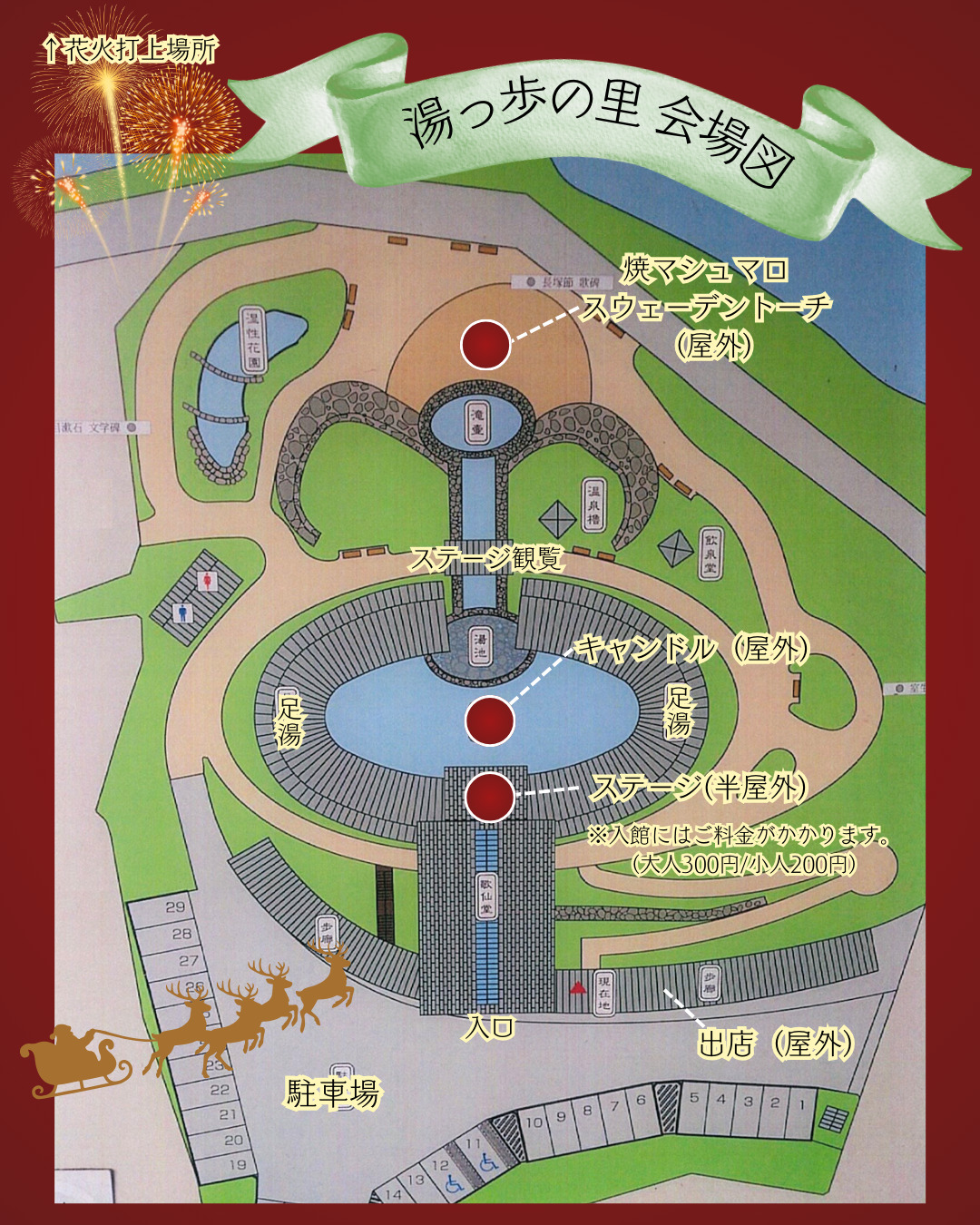 ※ステージイベントや花火については足湯(館内)からご覧いただけますが、入館料(大人300円/子ども200円)がかかります。