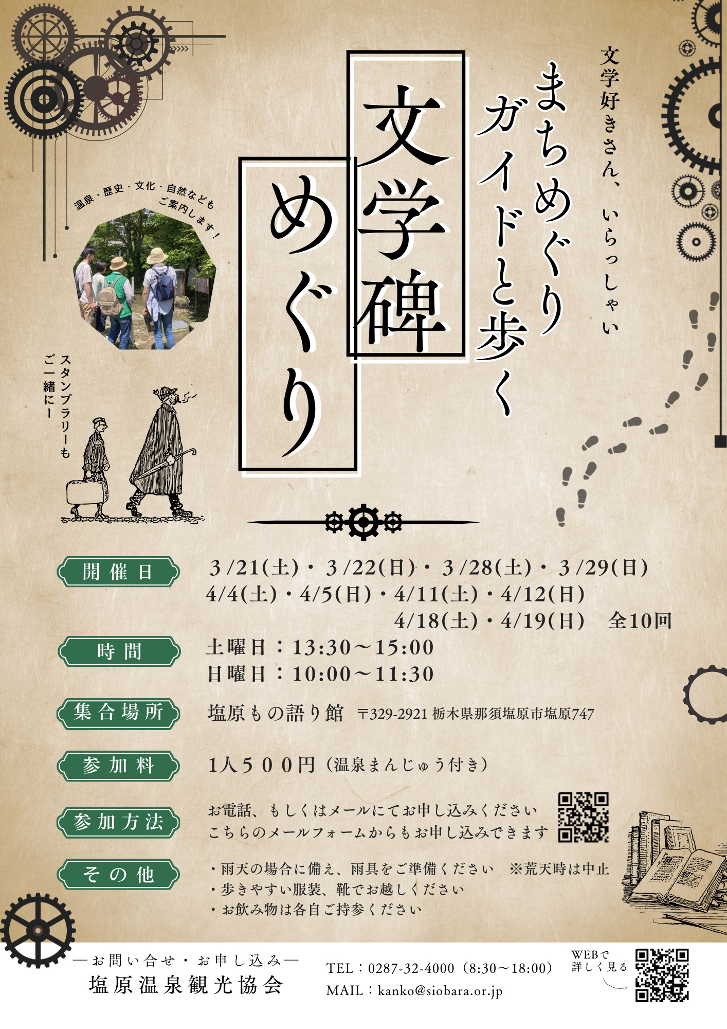 | ■お申込み方法 (当日参加OKです!当日希望の方はお電話、もしくは塩原もの語り館までお越しください) | ① お電話で申込み 塩原温泉観光協会 TEL:0287-32-4000(受付時間8:30~18:00) ② メールで申込み(前日までの受付) 塩原温泉観光協会 kanko@siobara.or.jp へ送信 【予約時のお願い】 件名に「文アルまちめぐり申込希望」と記載。 本文にお客様情報(お名前・連絡先・参加日・参加人数)をご入力ください。 例)・名前 〇〇 〇〇〇 ・連絡先 090-XXXXーXXXX ・参加日 3/21(土) ・参加人数 2名 |