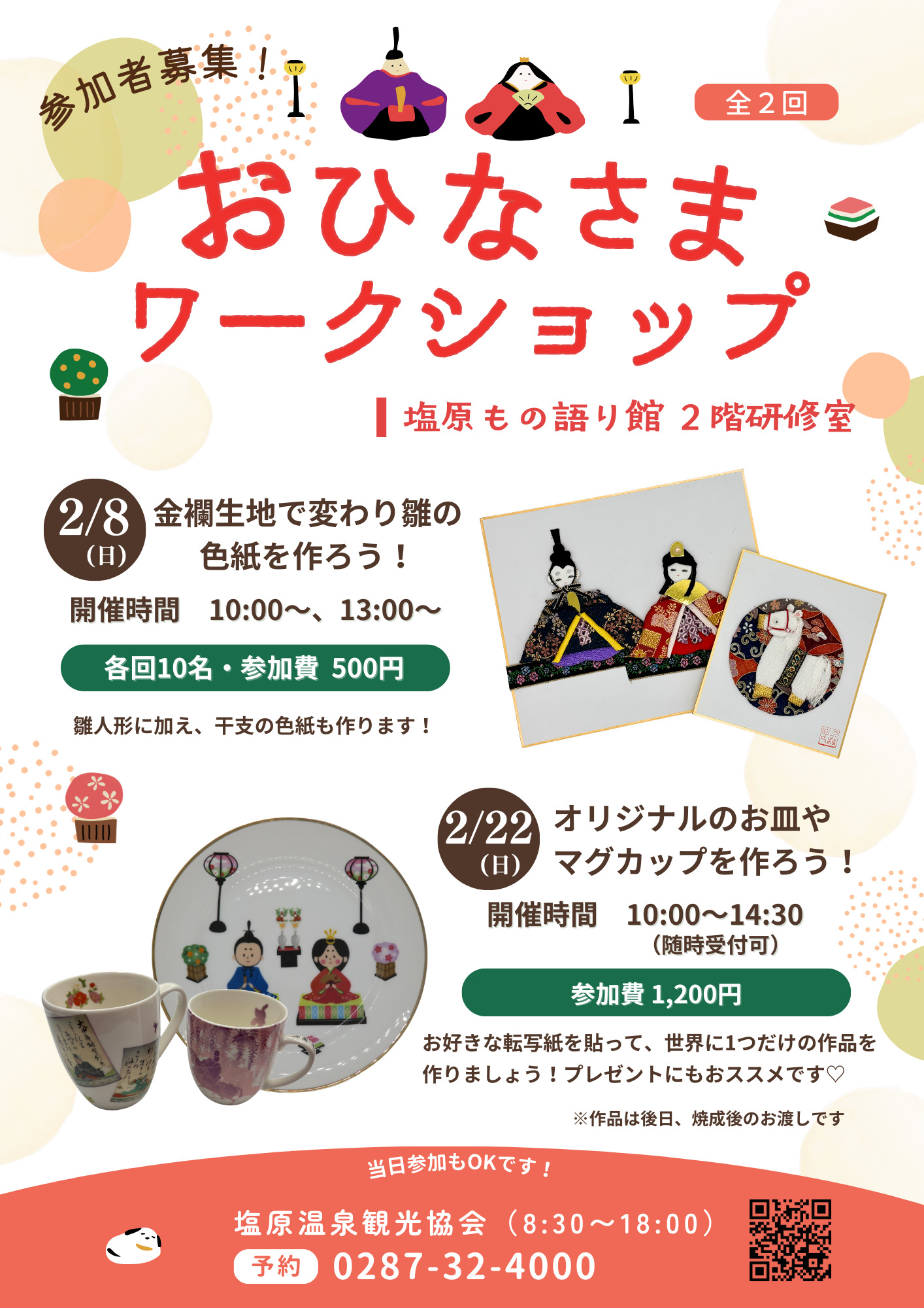 期間中、お雛様にちなんだイベントとワークショップを開催!さらにお雛様が飾りつけされた施設を10箇所めぐりスタンプを集めると、宿泊券が当たるガラポン抽選に参加、もしくは素敵な和雑貨や温泉むすめ塩原八弥(やや)ちゃんの缶バッジがもらえます!毎年、特に女性のお客様に大人気なスタンプラリーです♪ご家族や恋人と、またはお友達を誘ってぜひ塩原温泉に遊びに来てください♡