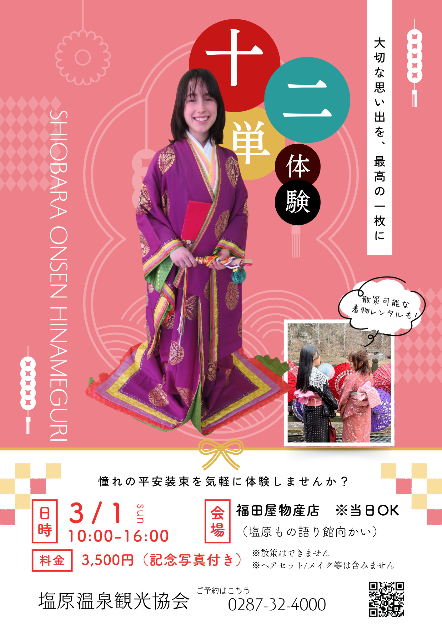 | 3月1日(日) 桃の節句イベント《桃の節句の宴》 | 会場①:福田屋物産店(塩原もの語り館向かい) ◎十二単着付け体験/事前予約 10:00~16:00(20分毎) 記念写真付きで3,500円 ※散策はできません 【ご予約は塩原温泉観光協会まで TEL:0287-32-4000】 ◎着物着付け体験/予約不要 10:00~16:00 体験料金:1,000円 お好きな着物を着て、温泉街をのんびり散策できます♪ 会場②:塩原もの語り館 ◎『琴アンサンブル楓(メイプル)』による琴演奏・琴体験 11:00~、13:30~ |