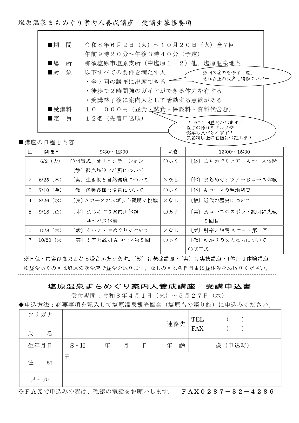 | ■日 程 | 令和8年6月2日(火)、25日(木)、7月10日(金)、8月26日(水)、 9月18日(金)、10月8日(木)、20日(火) 全7回 午前9時20分~午後3時40分(予定) |
