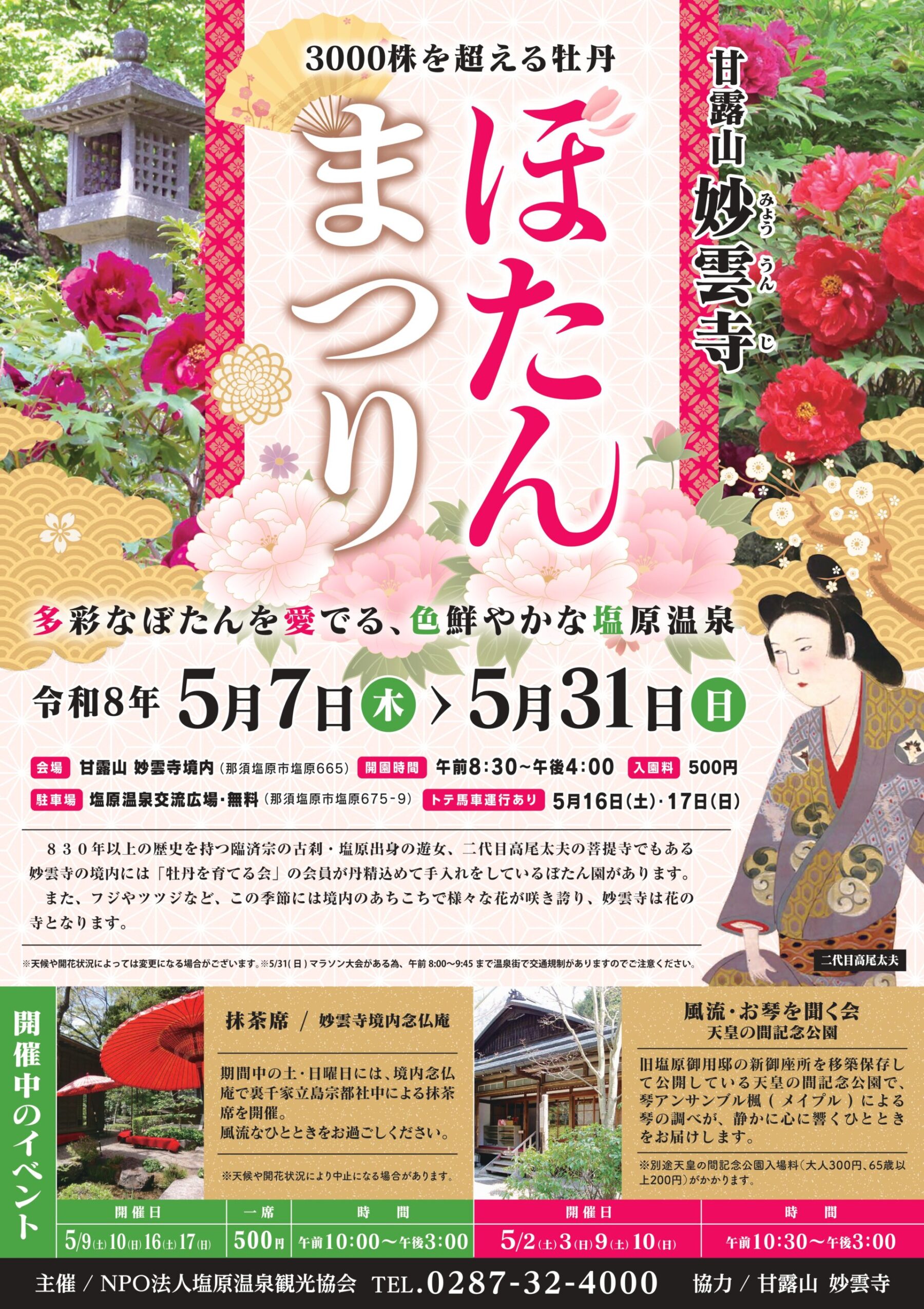 | 開催概要 | 時間:朝8時30分~夕方4時 入場料:お一人様 500円 会場:甘露山 妙雲寺境内 ※期間以外は開花状況に関わらず「牡丹園」への立ち入りが出来ませんのでご了承ください 会期中、抹茶席やトテ馬車運行、お琴の演奏など様々なイベントを開催いたします! 詳細は「ぼたんまつり」公式HP(こちらをクリック)をご覧ください。 |