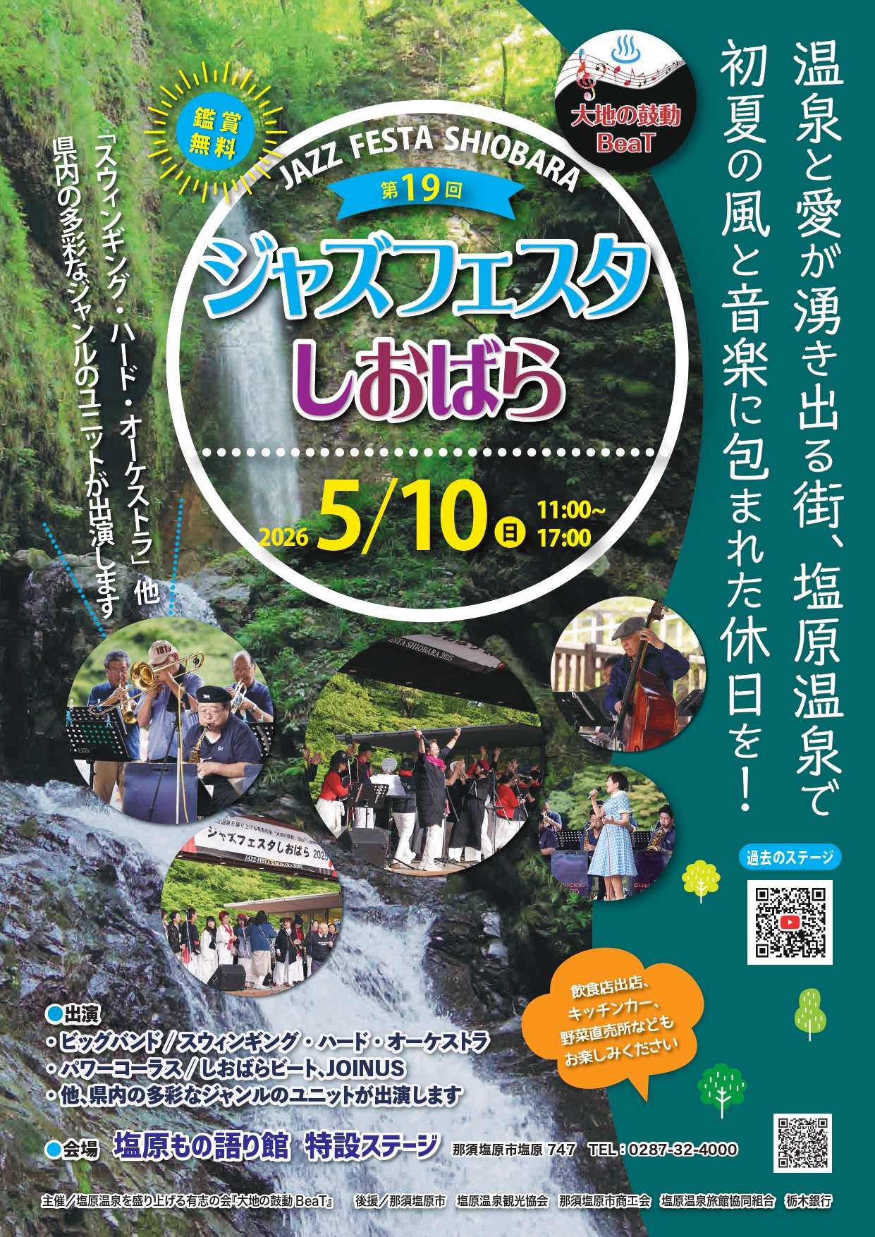 | 開催概要 | 時間:11:00~17:00(予定) 料金:無料 会場:塩原もの語り館 特設ステージ ※もの語り館には駐車できません 出演:ビッグバンド/スウィンギング・ハード・オーケストラ/パワーコーラス/しおばらビート/JOINUS他 主催:塩原温泉を盛り上げる有志の会『大地の鼓動BeaT』 飲食店出店、キッチンカー、野菜直売所などもあるので、ぜひお食事も楽しみながらご覧ください(^^) |